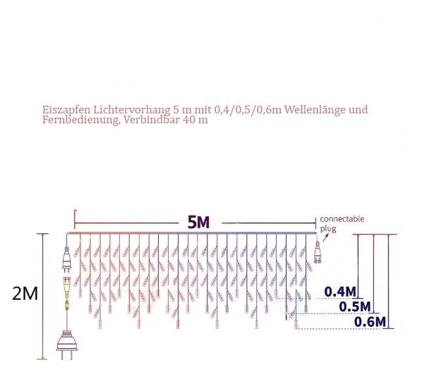 Lichtervorhang 5M mit 0,4/0,5/0,6m Wellenlänge, 8 Modi und Fernbedienung, Warm Licht, Verbindbar 40M, Für Außen